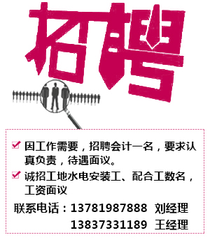 誠招工地水電安裝工、配合工數名,工資面議。聯系電話:1378